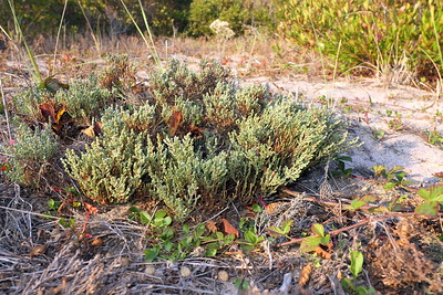 We will see that the dominant species is Spartina alterniflora (salt marsh cordgrass) at the lower, more regularly flooded areas of the marsh. At higher more irregularly flooded areas, Distichlis spicata (saltgrass) and Spartina patens (saltmeadow cordgrass) predominate. On slightly higher areas, salt scrub vegetation survives, which includes Baccharis halimifolia (groundsel-tree) and Iva frutescens (maritime marsh-elder). Other plants we will see are Solidago sempervirens (seaside goldenrod), Symphytotrichum tenuifolium (saltmarsh aster), Hudsonia tomentosa (sand false heather), Limonium carolinianum (sea-lavender), and Ammophila breviligulata (American beach grass).