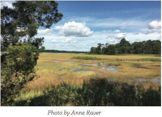 Because Anne walks this preserve of the Warren Land Trust a few times a week, she has become familiar with the cycles of particular trees, shrubs, ferns, grasses and herbaceous plants. That familiarity extends to watching how the marsh has changed with rising sea level, more powerful tides and stronger winds. Though not a botanist, Anne learns more each time she returns to this varied 60-acre preserve which hugs the east side of the Palmer River. The trails traverse a hardwood forest with many fern species, as well as meadow and salt marsh.