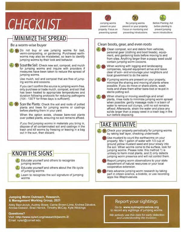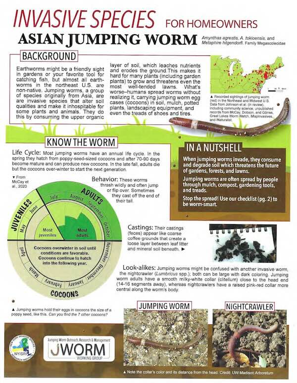 Asian jumping worms are spreading aggressively in the Northeast. These worms are particularly destructive because of their high reproduction rates, ability to live in very dense clusters, voracious appetites, and large grape nut size castings (feces) that are inhospitable to plants and soil organisms. Looking for a comprehensive wealth of information about these worm? The New York Invasive Species Research Institute’s two page flyer is an excellent resource. Click here for pdf version of this flyer.