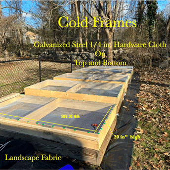 The bottom and top of each frame has galvanized hardware wire to keep out rodents. A piece of landscape fabric is placed under each frame to deter unwanted plant material growing within the cold frames.