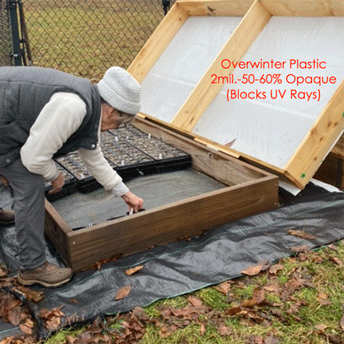 Attached to each cold frame is a large piece of overwintering plastic. This plastic sheet is 50-60% opaque and blocks UV rays. It also helps to maintain constant temperature and moisture inside the frames to keep the seed plug trays cold and moist throughout the winter. In the spring, the plastic helps speed up growth as temperatures increase.