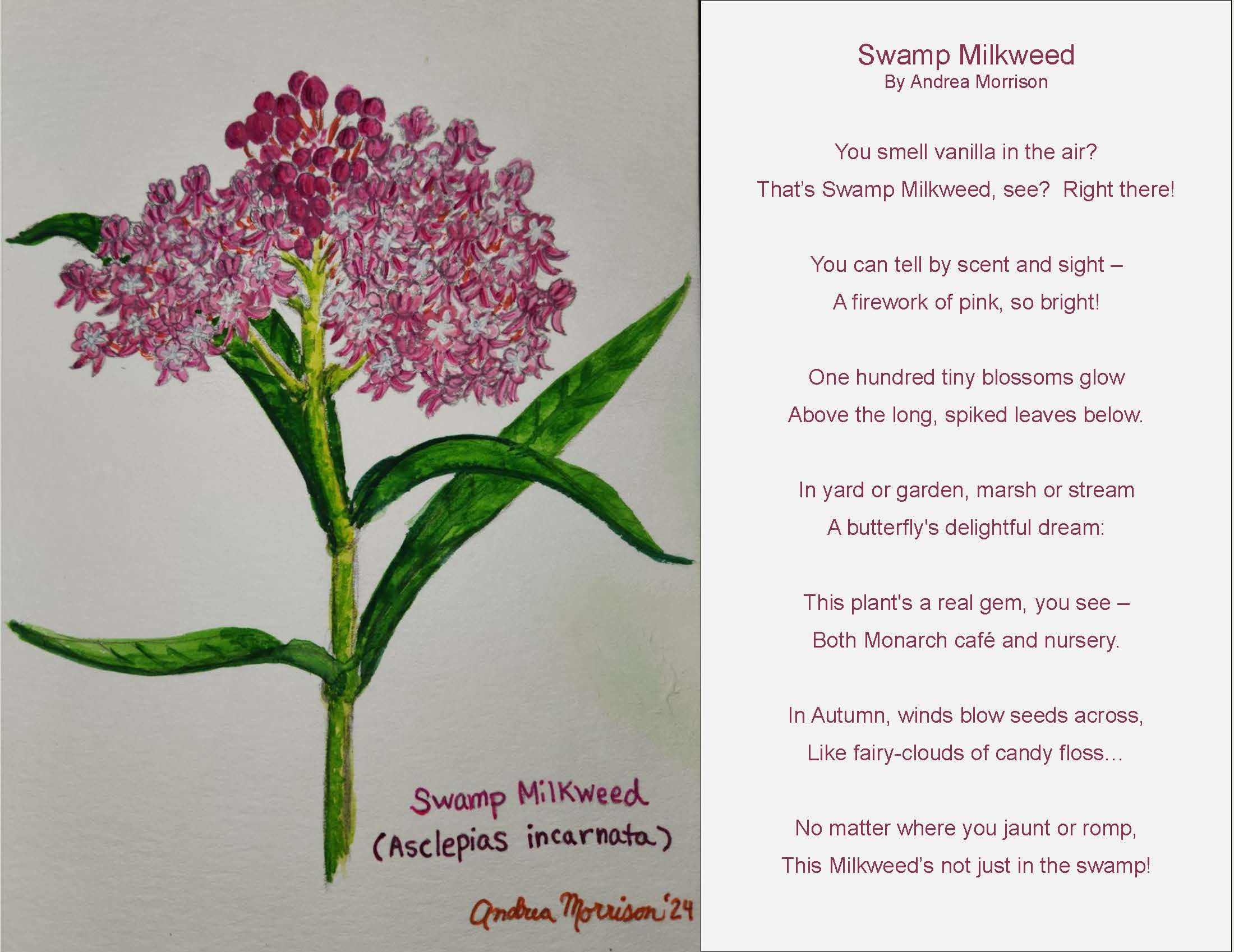 In the second of her series of drawings and playful verse spotlighting the species currently in the ReSeeding RI pipeline, Andrea Morrison focuses on swamp milkweed. ReSeeding RI, an initiative of RIWPS, aims to increase the number of plants, sourced from local native wild populations, in the plant supply chain so that they can grace more of our landscapes, all the while sustaining the complex relationships among our plants, pollinators, other wildlife and even ourselves as well! Learn more about swamp milkweed.